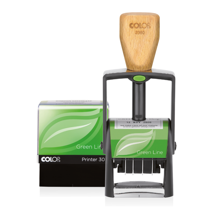 Gama de carimbos auto-tintados produzida predominantemente por materiais sustentáveis e reciclados.