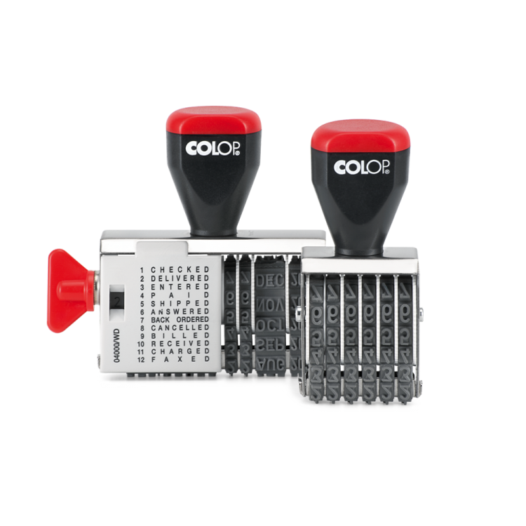 Carimbos de borracha tradicionais com bandas de caractéres gravados em profundidade para utilização em almofadas de carimbo.